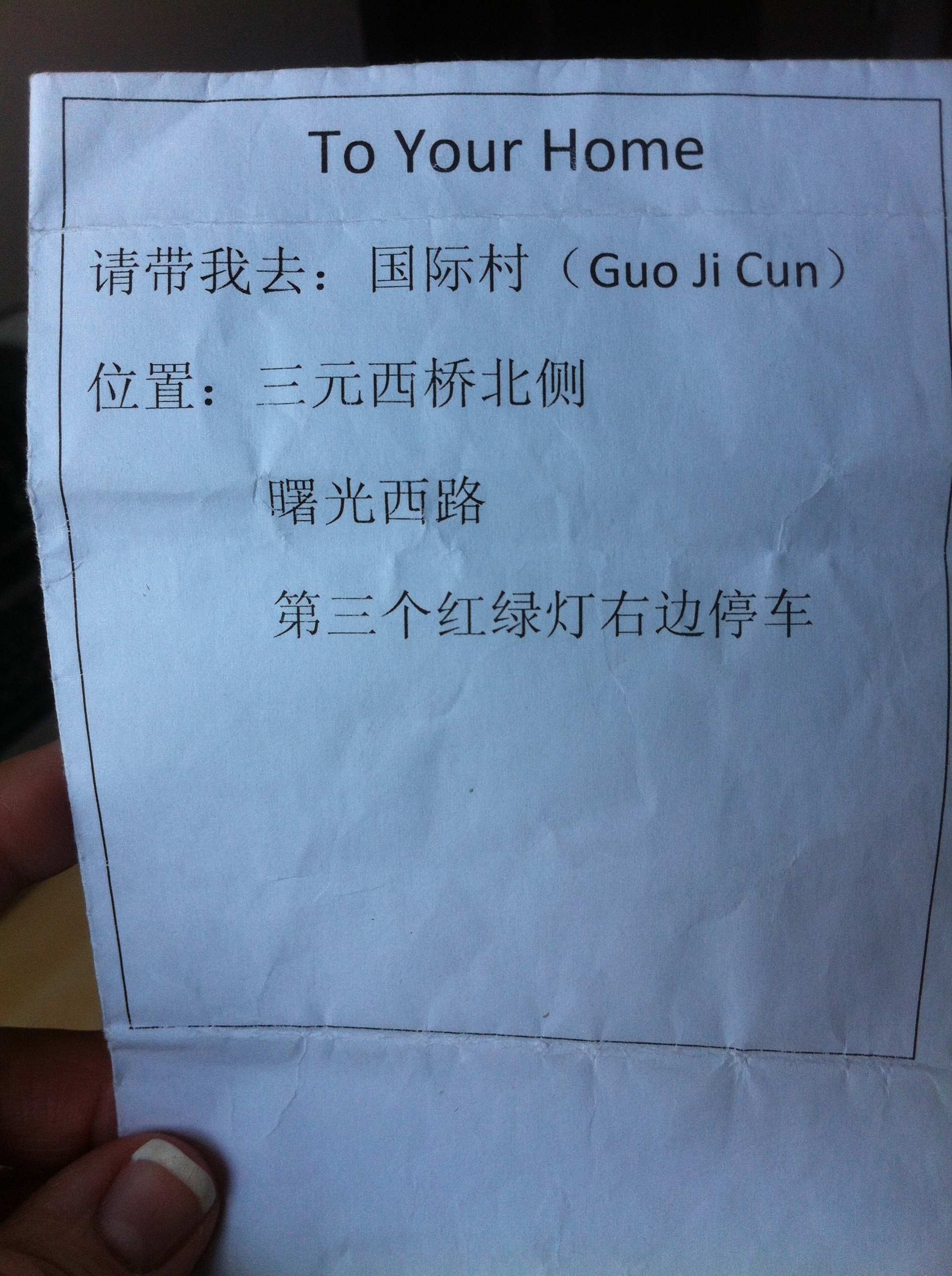 Arrival Photos (Judy) Posted on August 11, 2013 by gordonandjudy We need to get all of this to the airport! Our apartment is on the 25th floor of this building. One way to get around. First meal with friends – Peking Duck. How I communicate with the taxi driver.