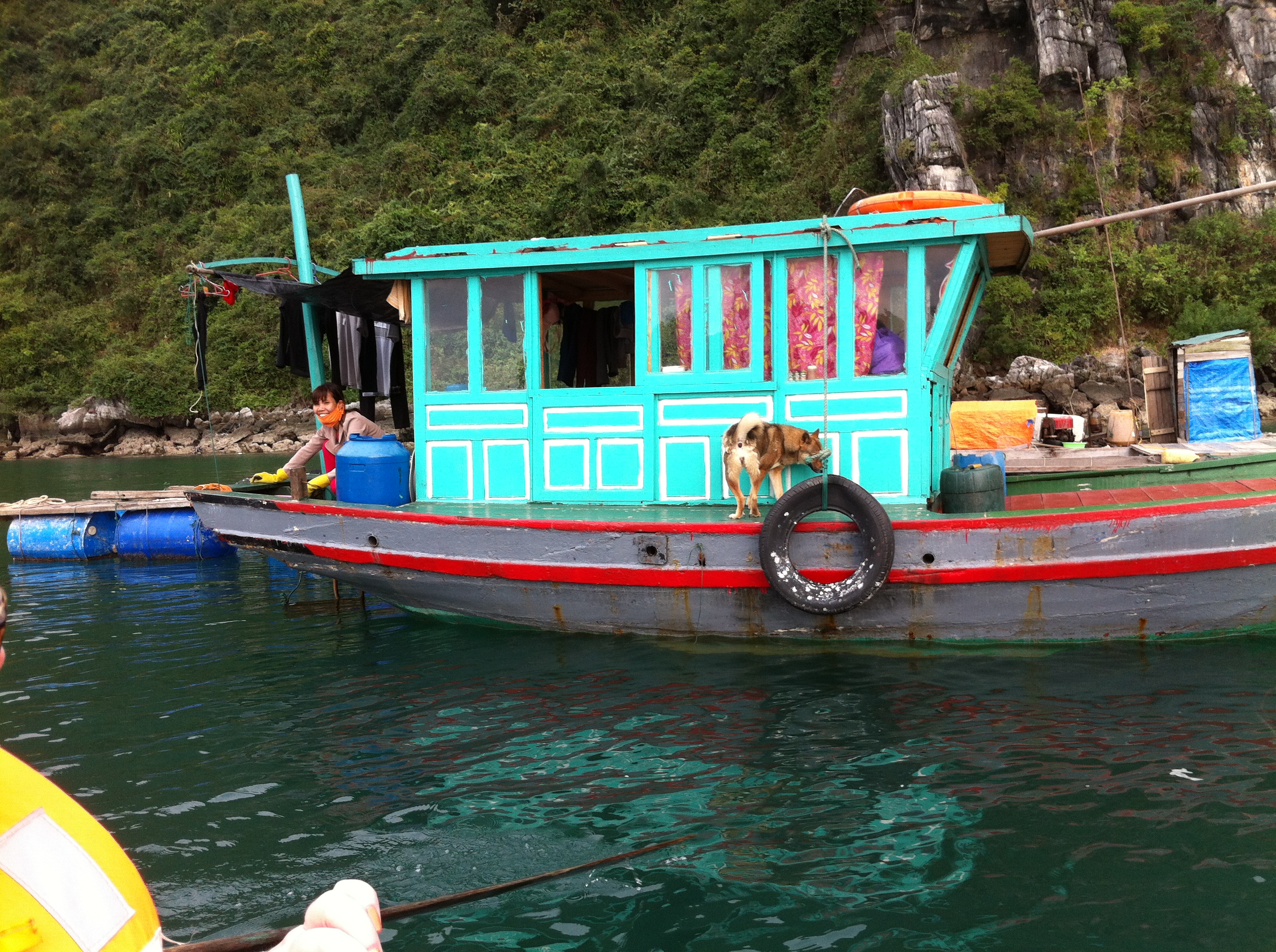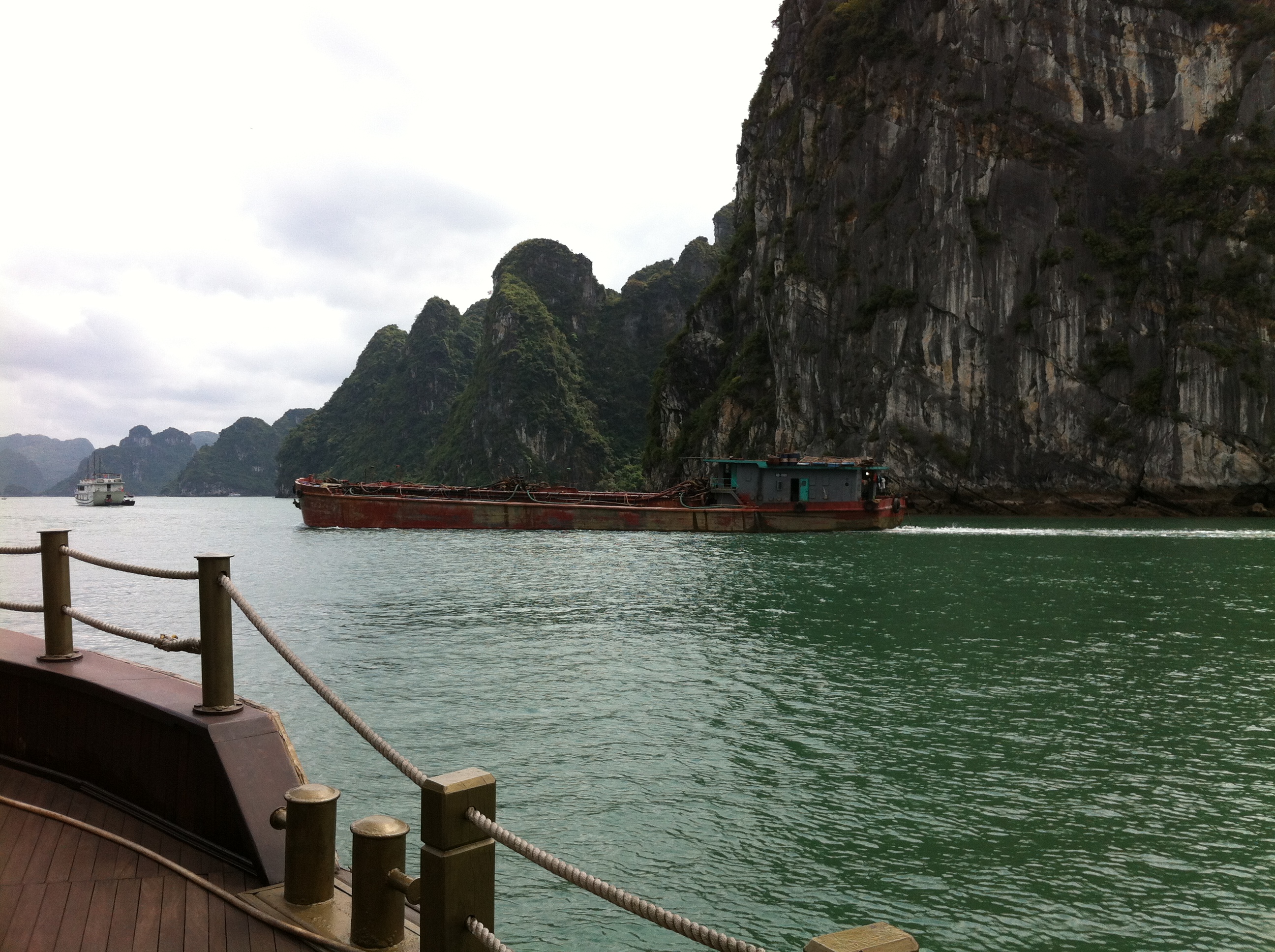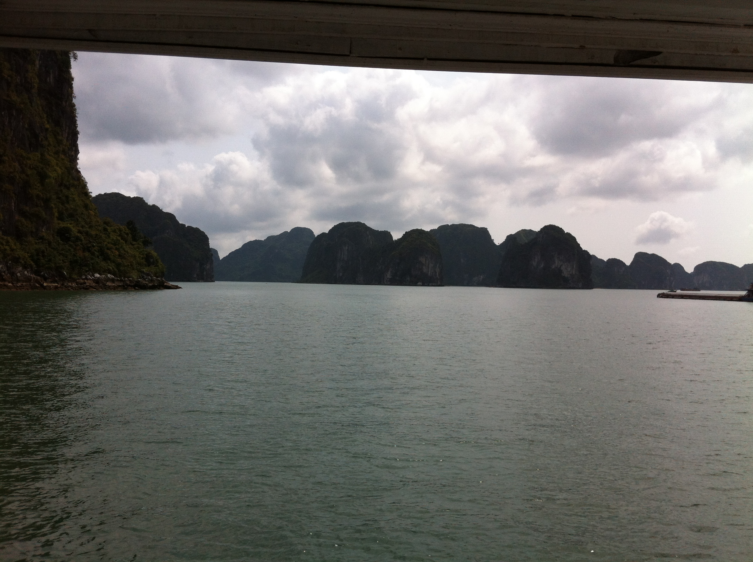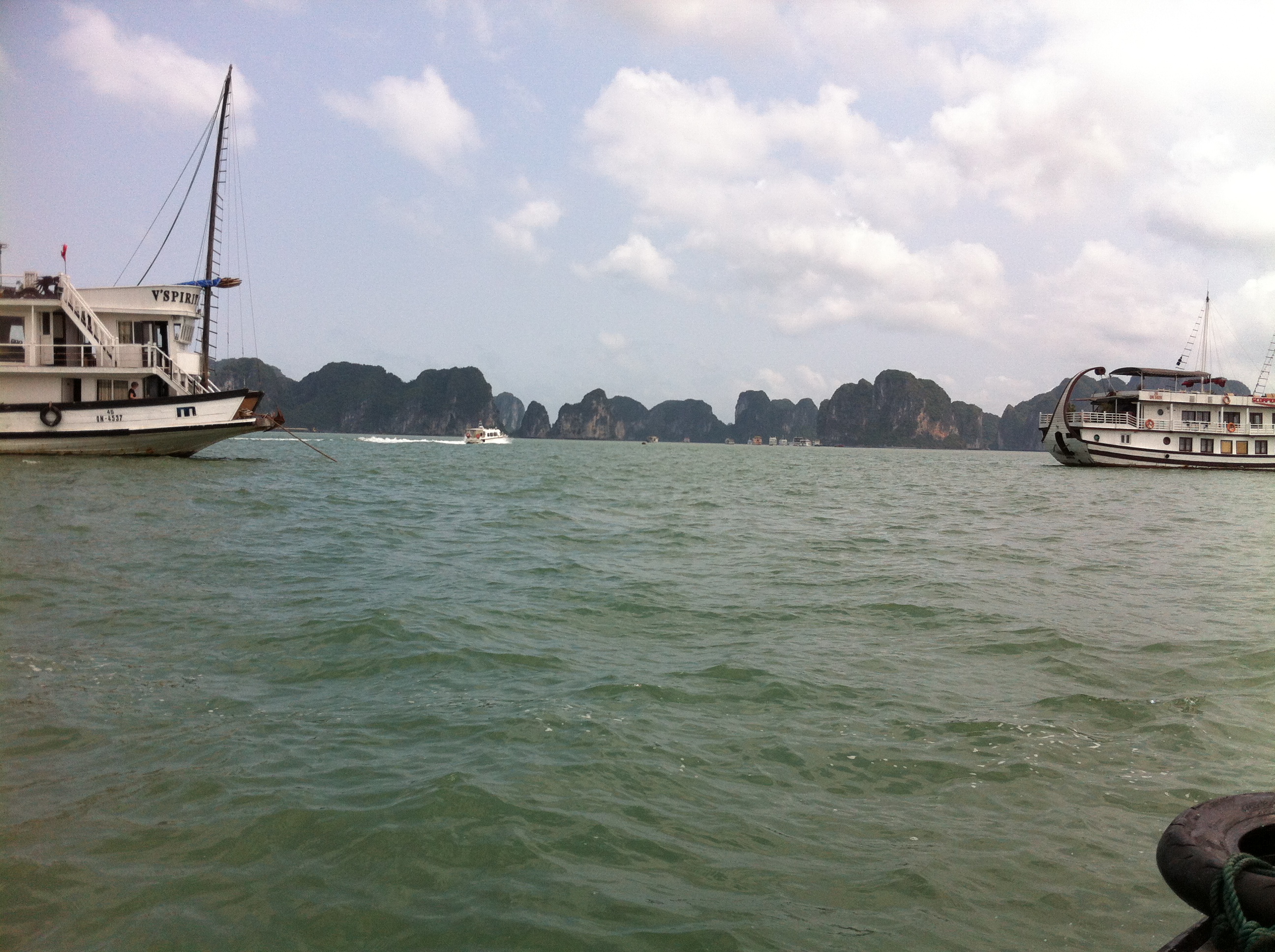 The drive to Halong Bay is interesting. The city section is busy with way too many motorbikes weaving in and out everywhere. A bus squeezed our car out at an intersection, resulting in a broken rear-view mirror for us, and a long scratch for the bus. Both vehicles pull over and discuss their options. The bus is going to Halong Bay also, so they’ll solve it when we arrive. The drive is slow. It’s a 2-lane highway with lots of trucks and buses, as well as cars and motorbikes. We arrived at noon after 4 hours on the road. The arrival pier is comfortable and we load the transport boat for the 15-minute ride out into to our cruiser.