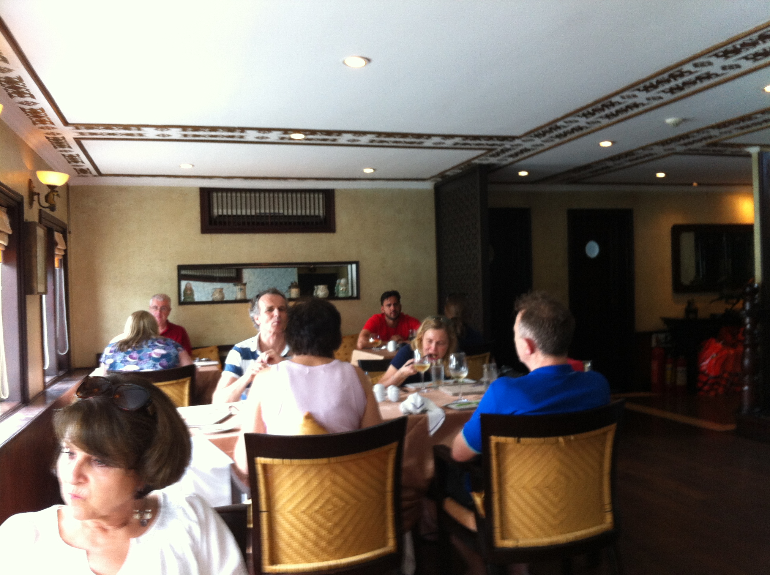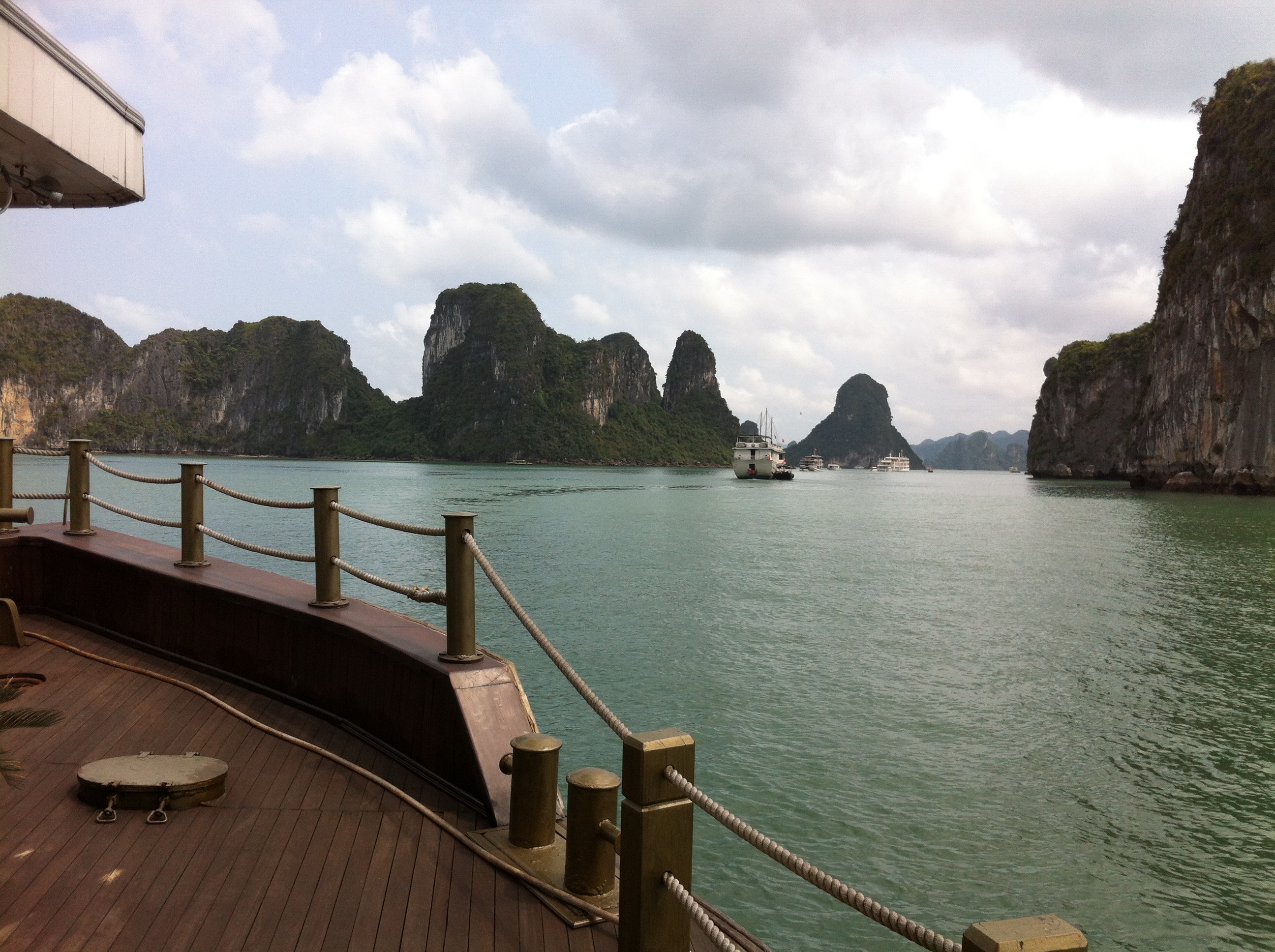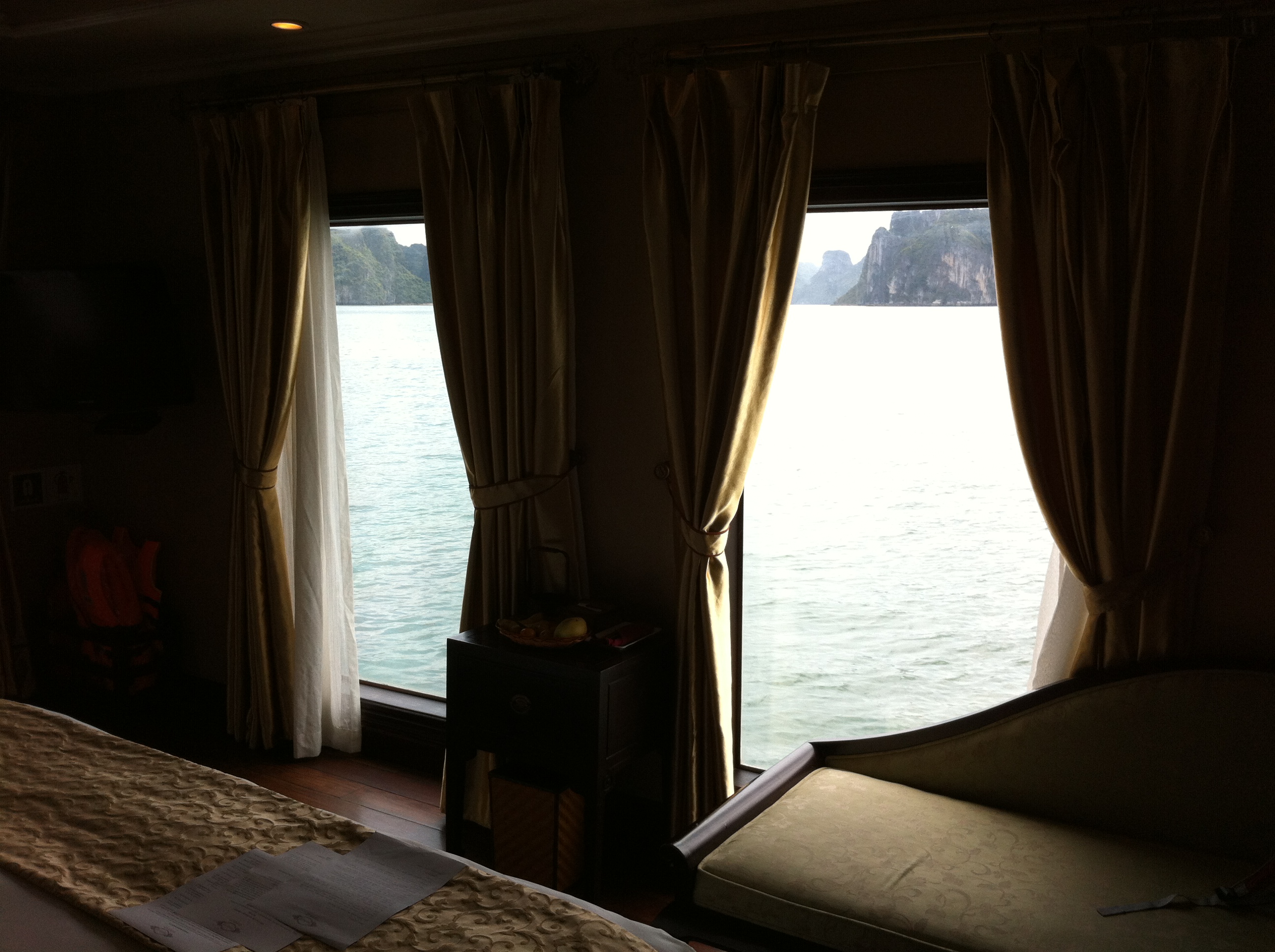 The boat is nice. There are 10 guests, including us. Our cabin is nice, with big windows and a private balcony. After we unpack our bags, we enjoy lunch while the boat begins the trip through the bay. The beauty of all the limestone islands is striking. We’re told nearly 2000 islands are scattered through the area.