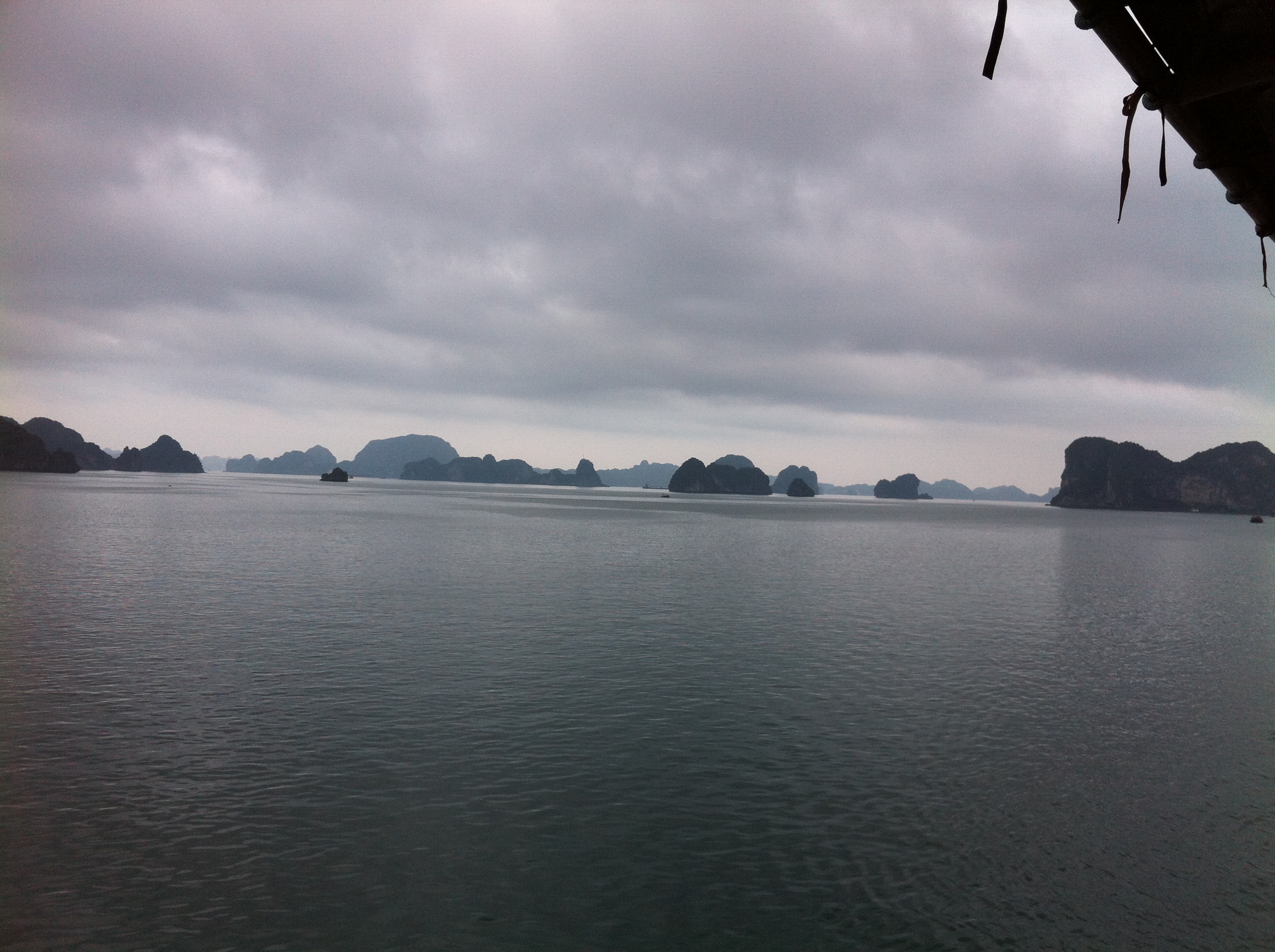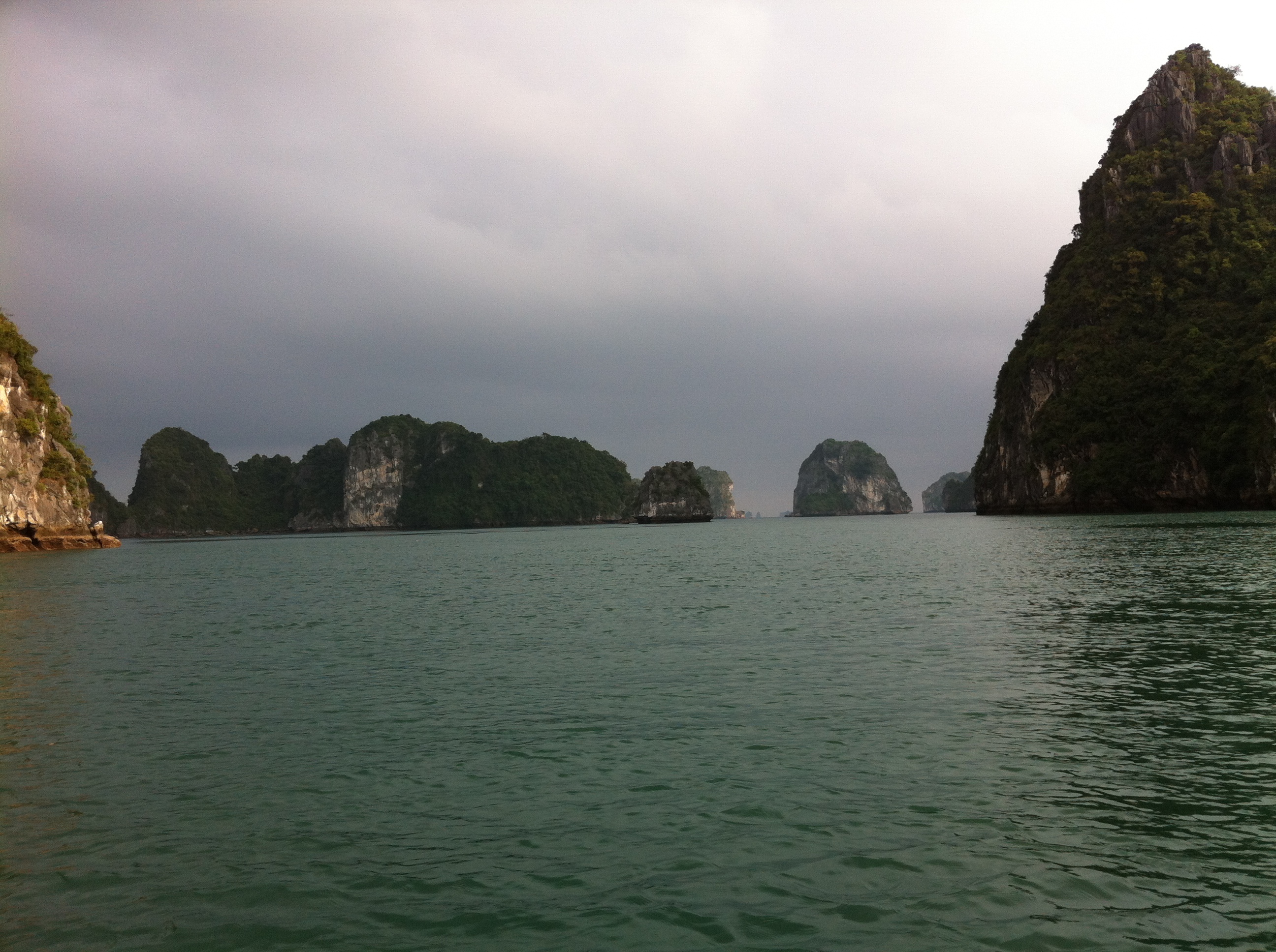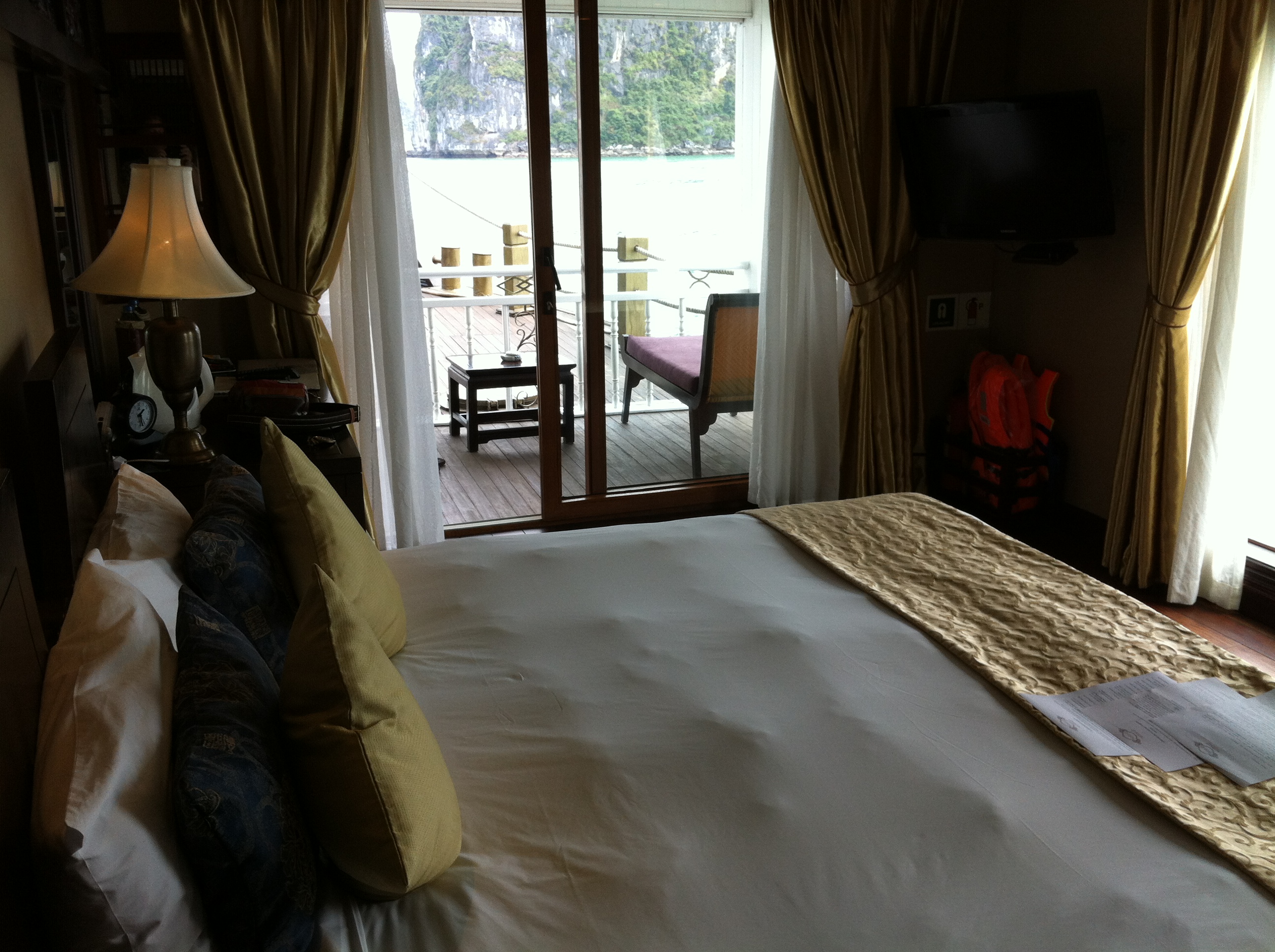The boat is nice. There are 10 guests, including us. Our cabin is nice, with big windows and a private balcony. After we unpack our bags, we enjoy lunch while the boat begins the trip through the bay. The beauty of all the limestone islands is striking. We’re told nearly 2000 islands are scattered through the area.
