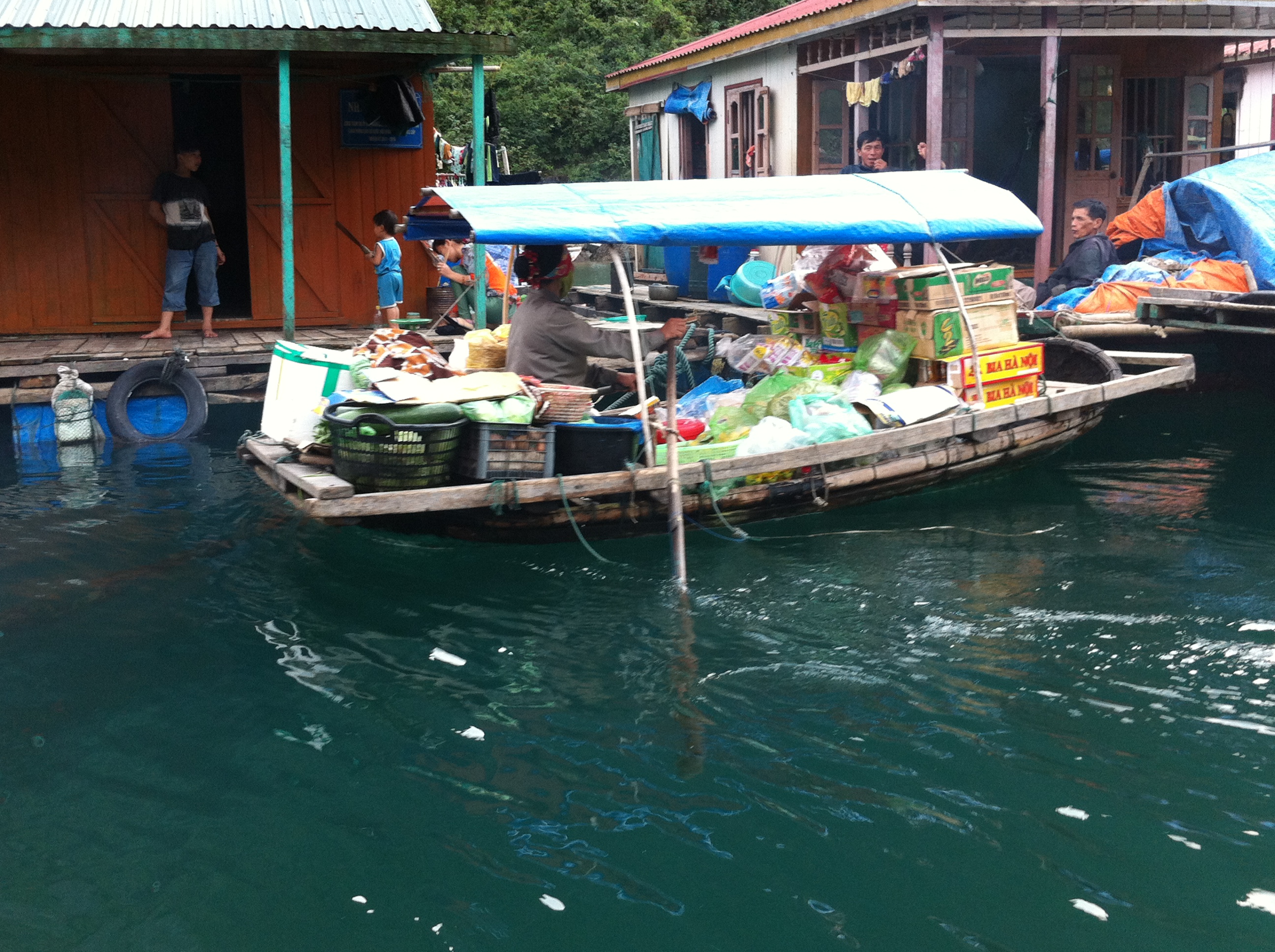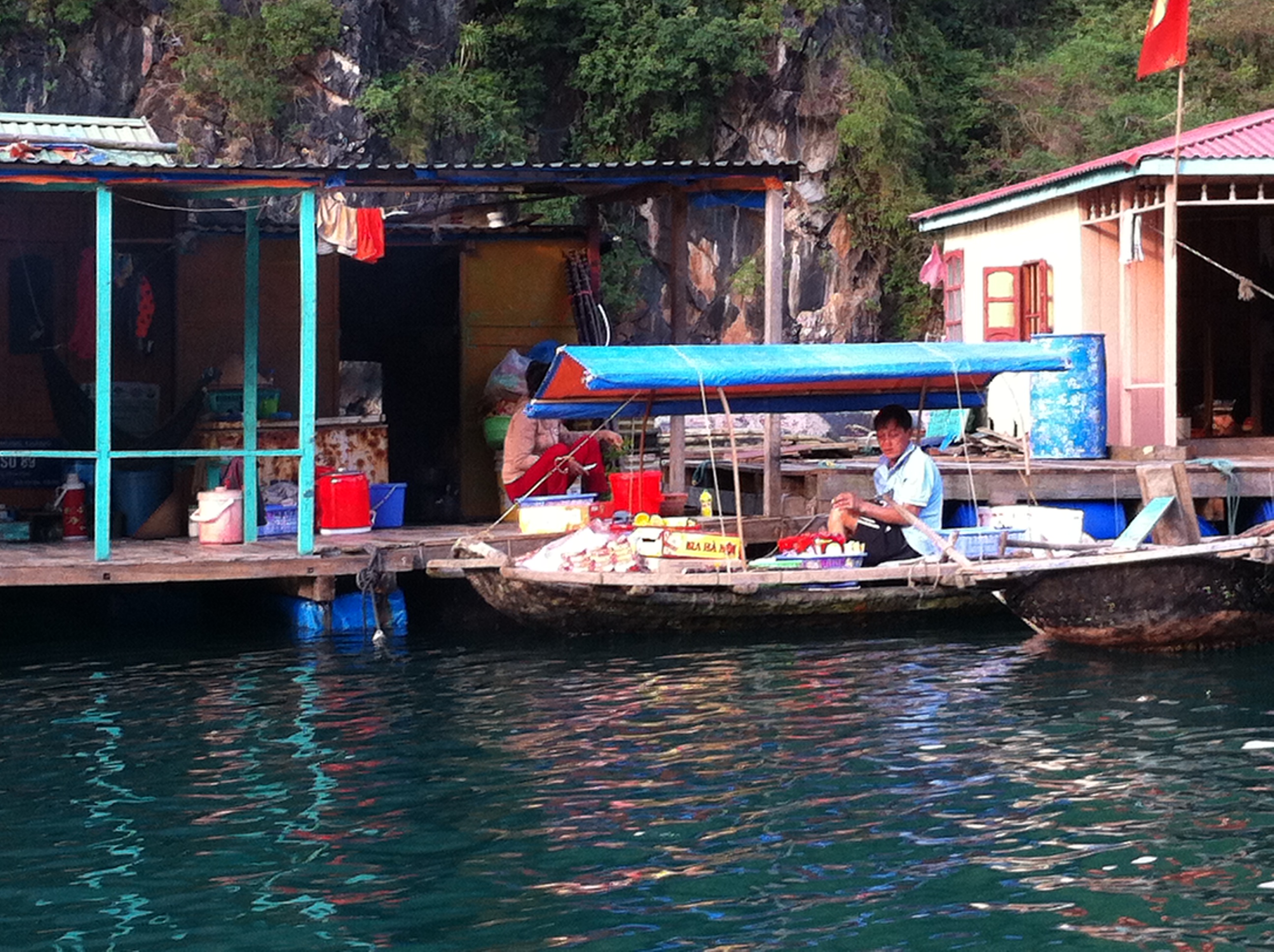 Our first stop is a small cave where we disembark and take a short tour. Next stop is a fishing village. Most of the local fishermen on the bay live on baots or floating “cabins” in this cove. A local woman paddles us around the area, giving us a close look at the lifestyle. After our tours, we load back on the cruiser and travel to the spot on the bay where we’ll be “parked” for the evening. Our boat guide explains there are 600 licensed “cruise” boats on the bay. 200 of them are night cruisers like ours.