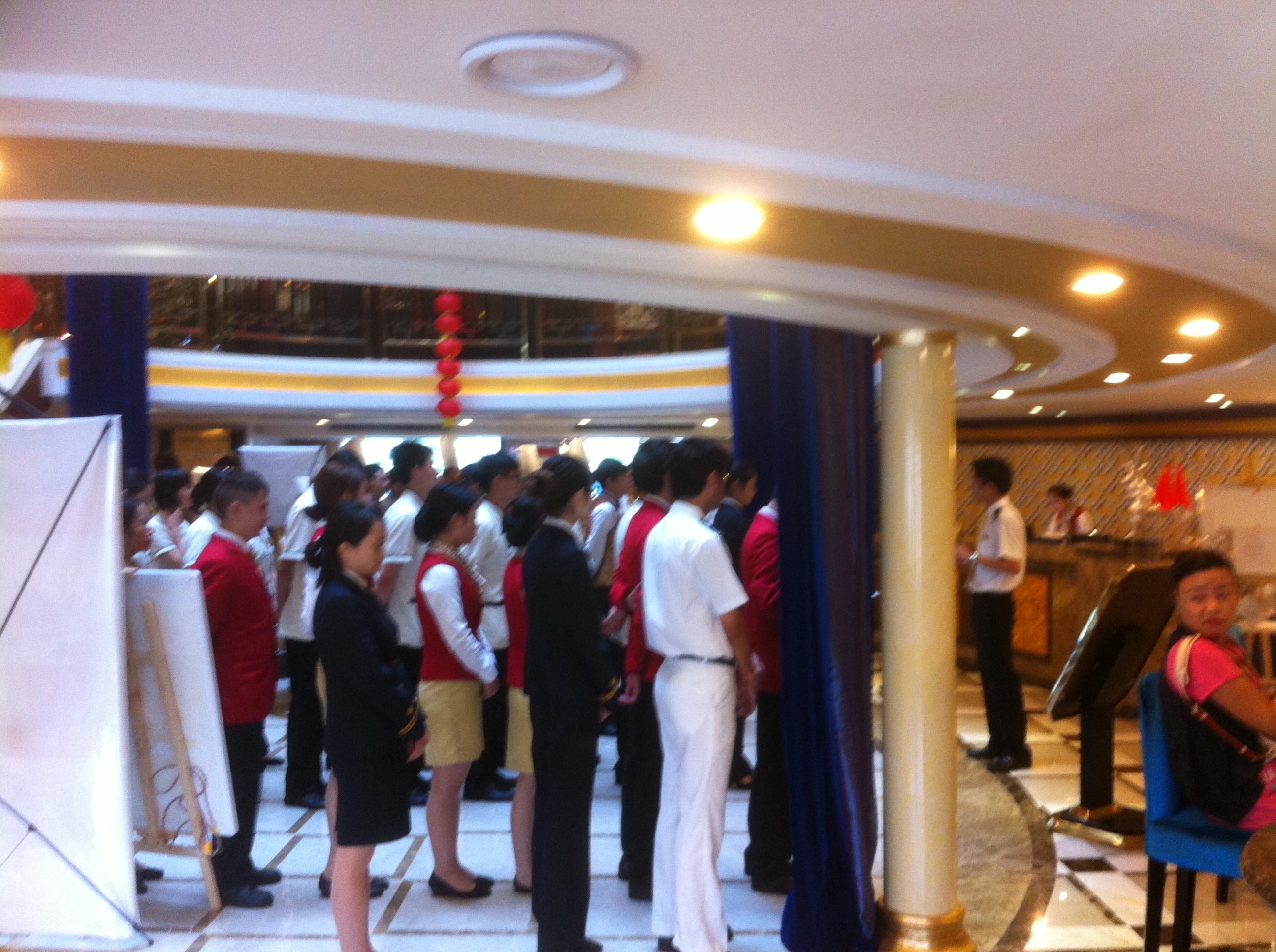 We get checked in and upgrade our room to the top deck (an advantage of being early). We also get the chance to upgrade to the top deck VIP dining room, which we also take advantage of. As Judy says, “this is what I’ve been working 37 years for, and I’m still working for it”. While we’re waiting to check-in, all the cruise staff line up for “assembly”. They get a pep-talk and a uniform inspection.